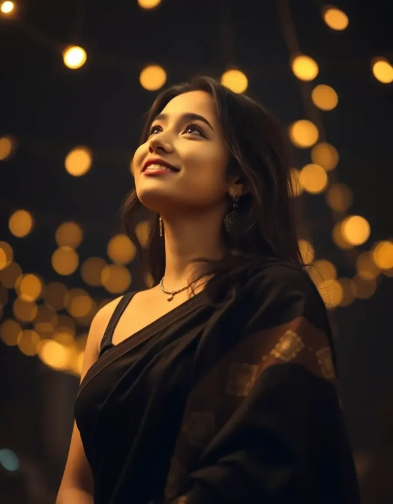 Use the uploaded reference image as the main base.Ultra-realistic cinematic portrait of a young women standing near glowing string lights at night. The women is wearing a stylish black saree, softly smiling and gazing upward with a dreamy expression. Background is dark and blurred, with warm golden bokeh lights creating a festive, magical atmosphere. Lighting […]