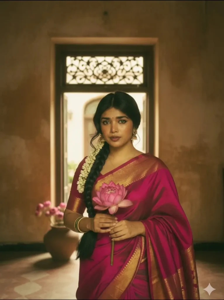 vintage South Indian old movie vibe matte makeup with Kajal and muted lipstick classic bun or braid with jasmine flowers soft sepia toned sunlight old Madra home or cinema backdrop dreamy nostalgic film aesthetic realistic and cinematic. Add some lotus in the background or like holding one. Pink saree prompt-Convert, 4k HD realistic, a stunning […]