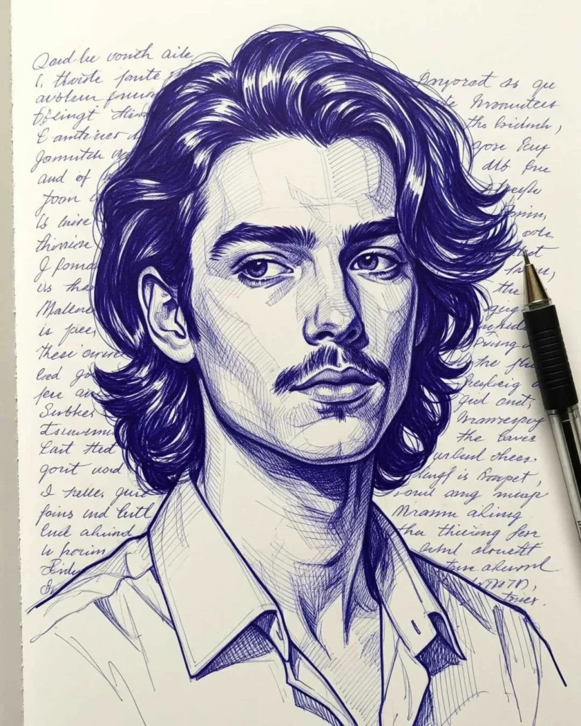 A hyper-realistic ballpoint pen sketch of a young man drawn on a notebook page, 3:4 ratio. The man has shoulder-length wavy black hair parted in the middle, a thin mustache, and no beard. He is facing slightly sideways, showing elegant facial contours and soft shadows from pen strokes. He wears a loose shirt with detailed […]
