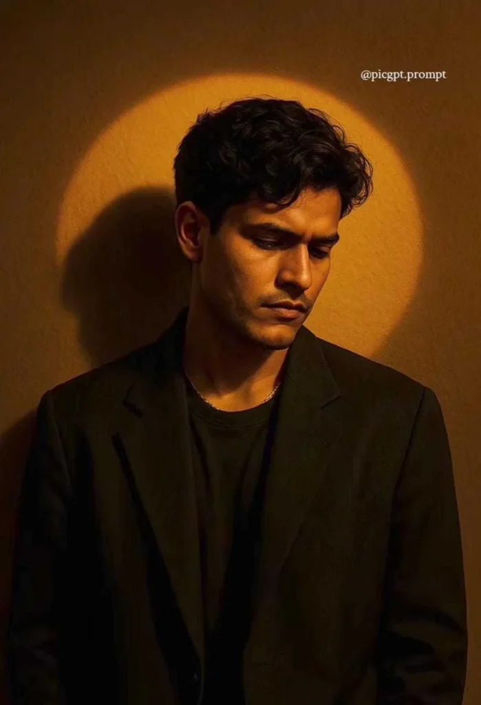 Create a hyper-realistic, moody portrait of a man standing against a plain wall, illuminated by a circular spotlight that casts dramatic shadows exactly like in the reference image. The lighting forms a bright amber-yellow halo around the subject, with soft shadows falling behind and to the right, creating a cinematic, emotional mood. Background should stay […]