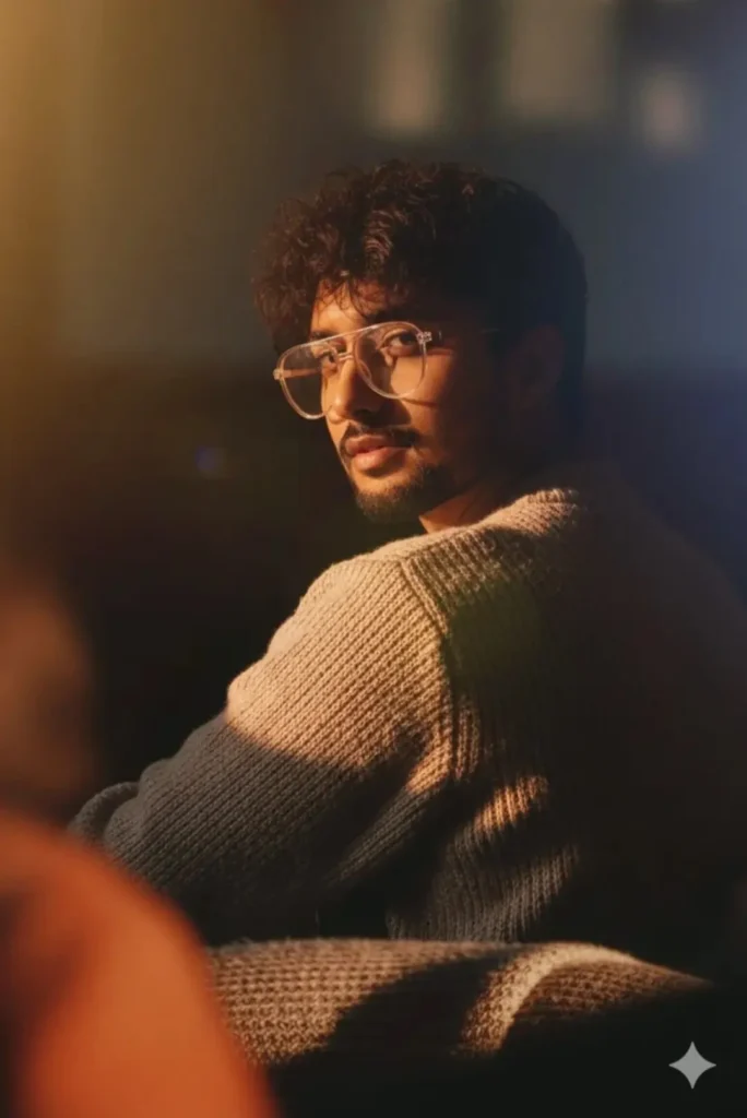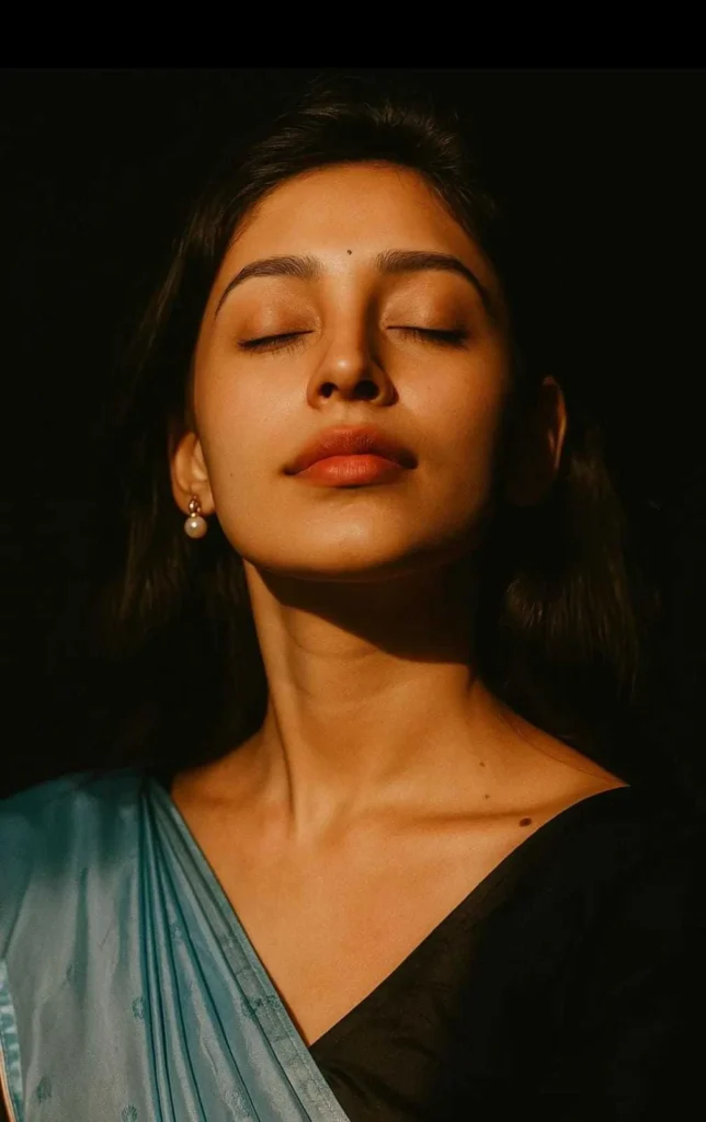Hyperrealistic, soft and dreamy portrait of a young Indian woman captured in warm natural sunlight. Gentle sun rays create soft, dappled shadows across her serene face. She has long, wavy brown hair with delicate wispy bangs, a few strands falling naturally over her shoulders and brushing lightly across her face. Her lips are tinted a […]
