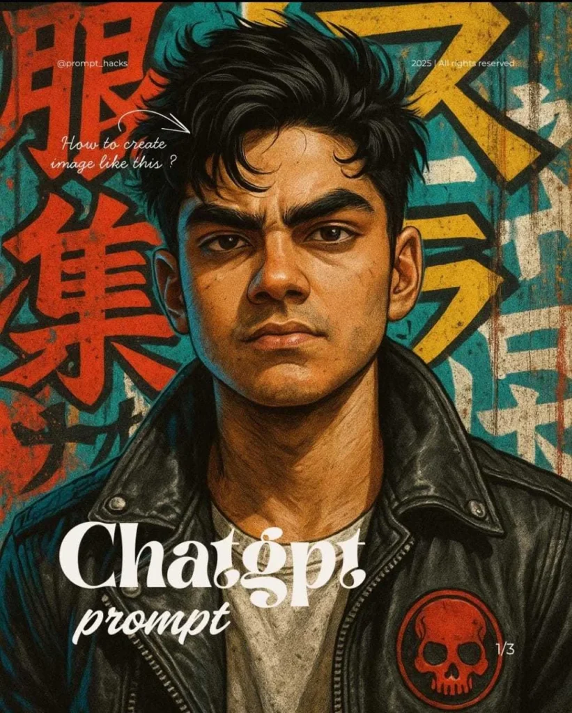Ultra Create a hyperdetailed, manga-inspired, streetart-style portrait of a rebellious young man (take face from reference image i uploaded), standing against a vibrant urban backdrop filled with abstract Kanji and bold graphic textures.