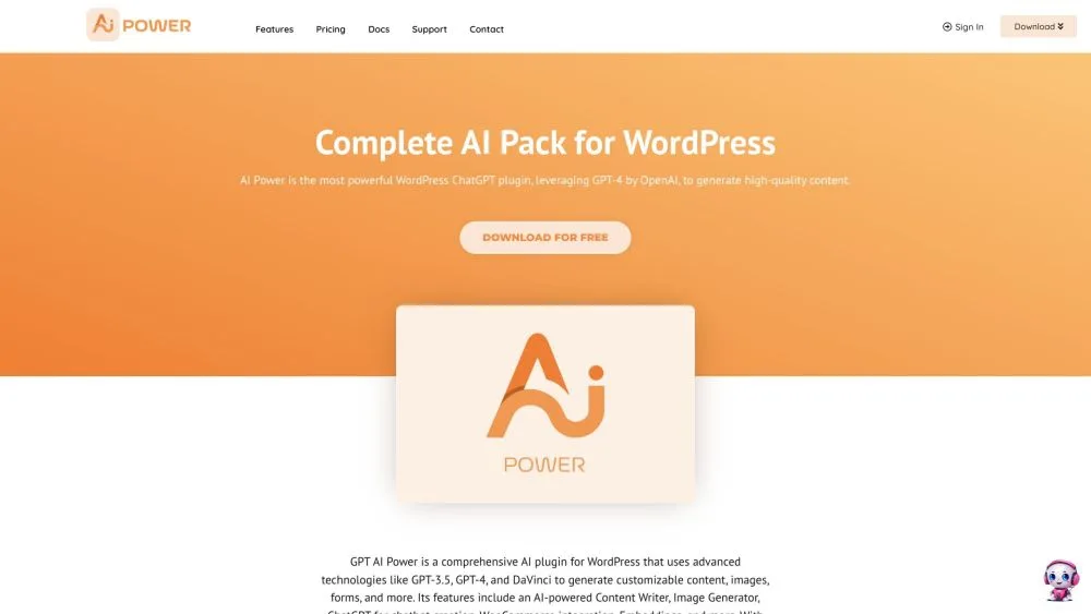 GPT AI Power is a comprehensive AI plugin for WordPress that utilizes advanced AI models like GPT-3.5 and GPT- 4 to induce customizable content, images, and forms. It also includes features like Chat bots, WooCommerce integration, Speech- to- Post, and Model Comparison Tool.